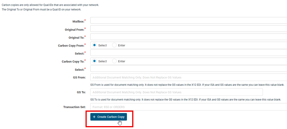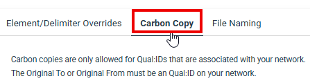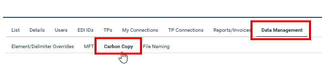 For example, a 3PL may want a copy of the inbound purchase order from a specific trading partner or you need a copy of an invoice to go to another system. A carbon copy is set up to replace the ISA and GS (if necessary) EDI IDs so the documents can be routed to their respective mailboxes. Carbon copies are setup by document type.